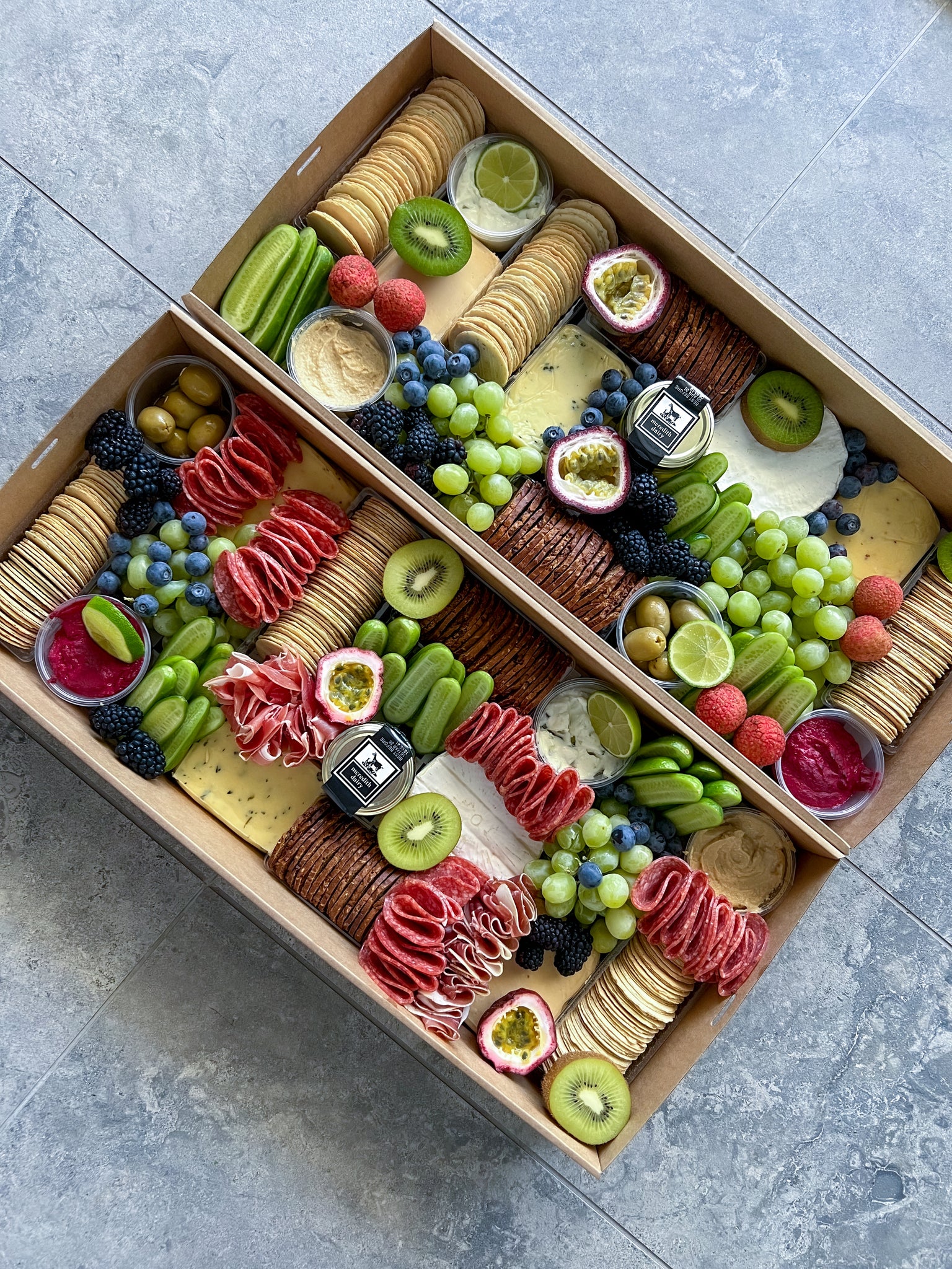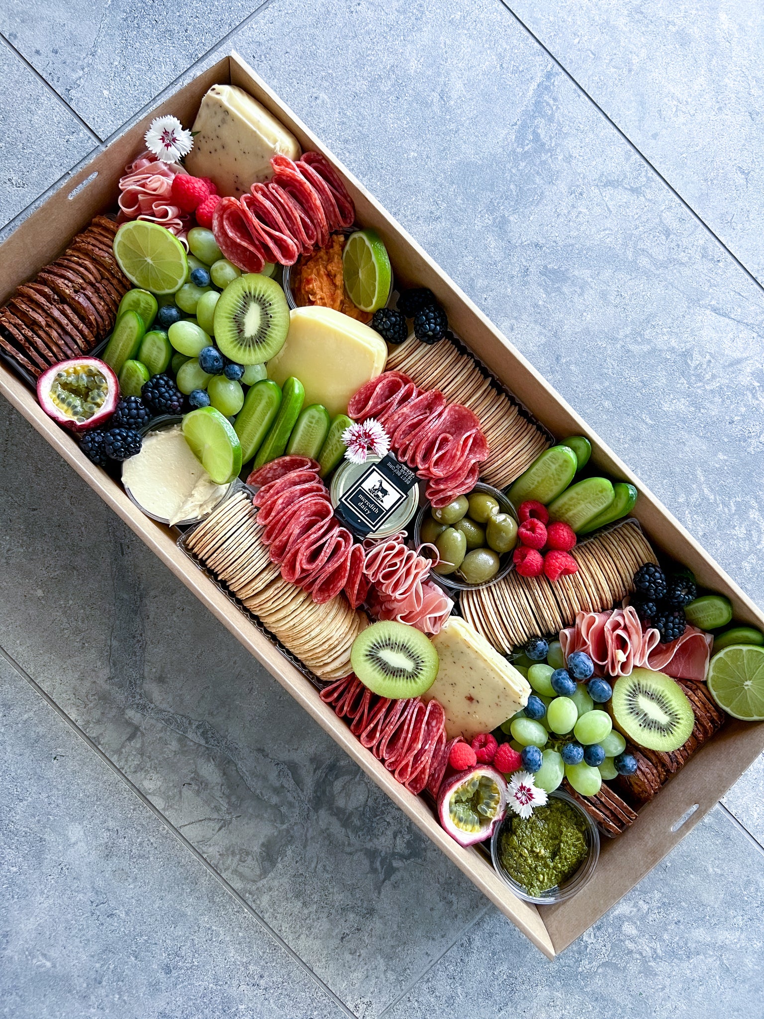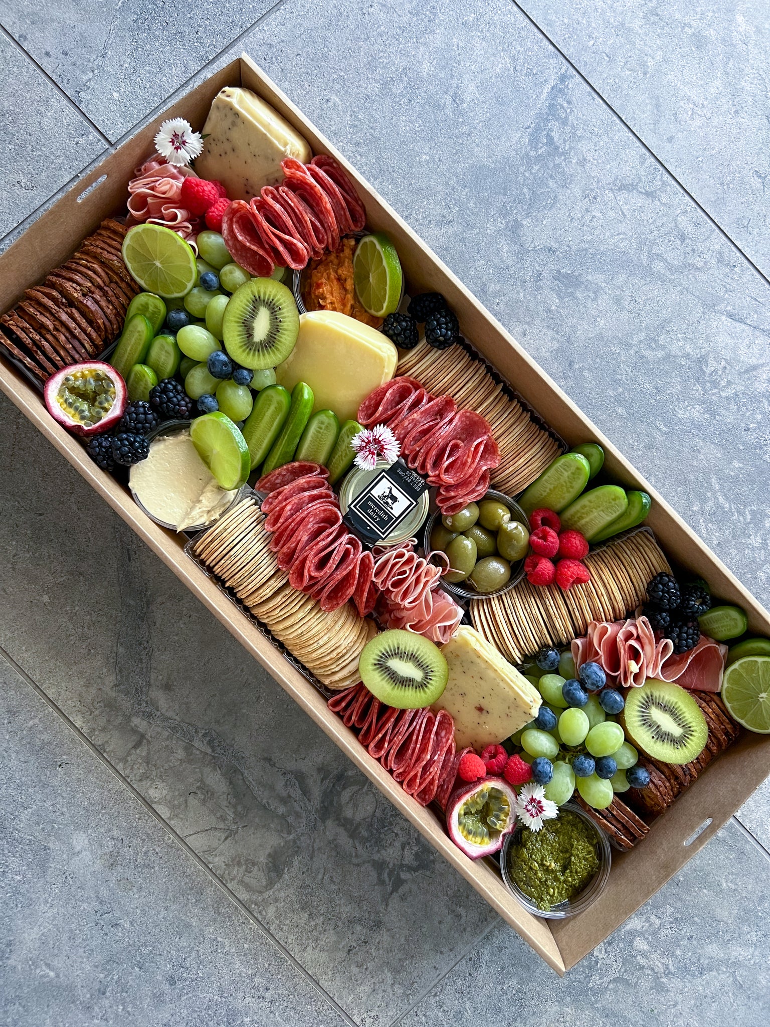 An abundant spread of artisan crackers, fresh fruits, dried fruits, nuts and a selection of dips to complement your cheeses and meats.